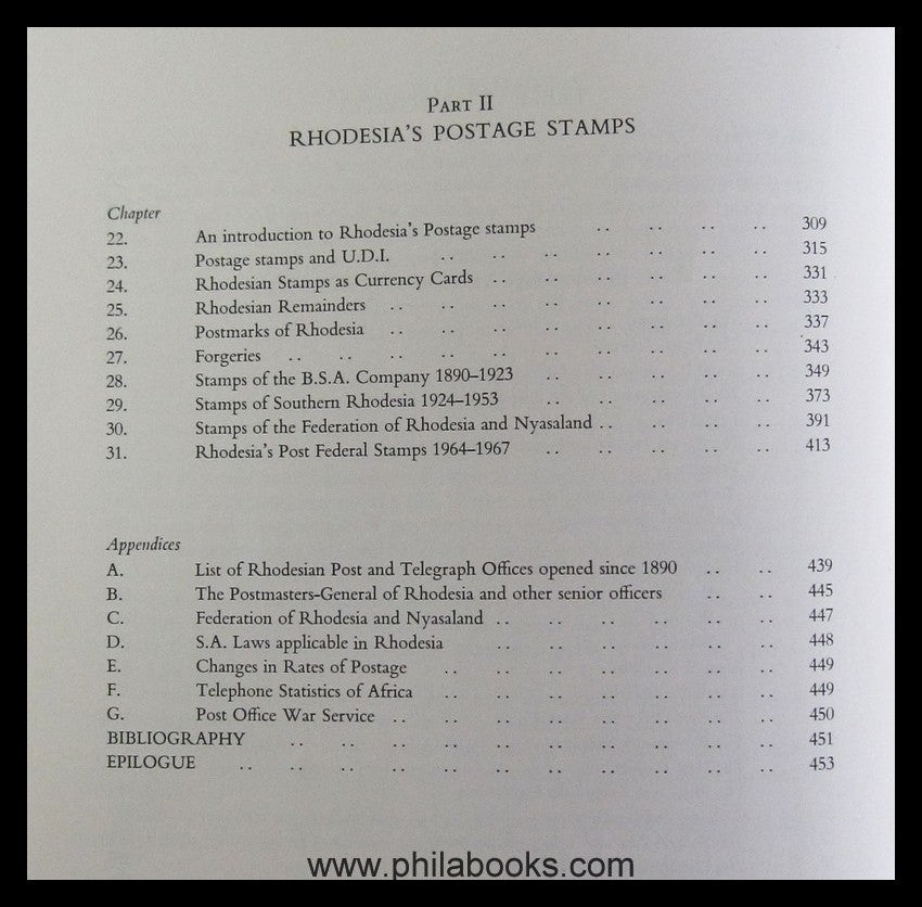 Smith, RC, Rhodesia - A Postal History, Its Stamps, Posts and Telegraphs, 1967, 453 pp., with illustrations and maps, the sought-after standard work on the postal history of Rhodesia, published in the then newly and then only briefly independent Rhodesia, printed by the stamp printing company 'Mardon Printers', Salisbury, imitation leather, loose cover, fixed book block. #2881