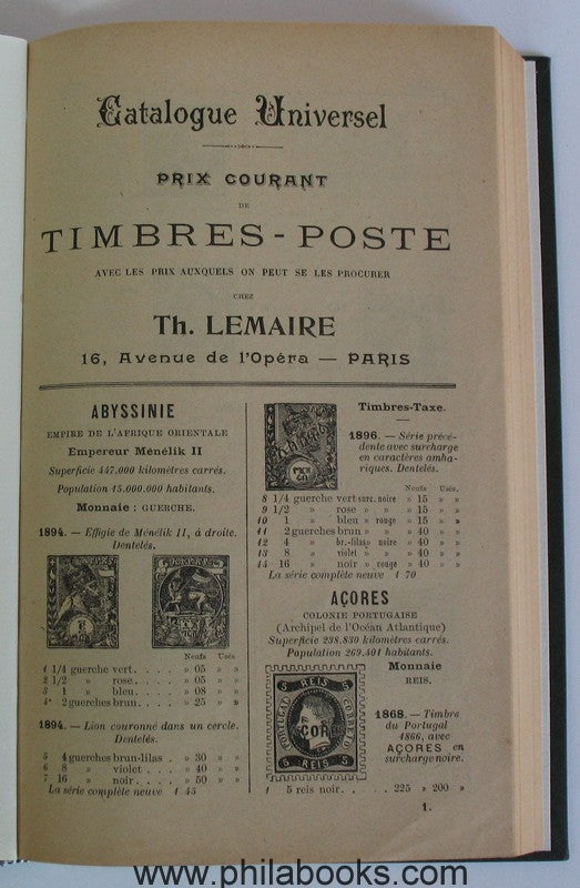 Lemaire, Th., Paris: Catalogue Universel Prix Courant de Timbres-Poste 1840-1900, 1900, All World Catalog, 456 pages, with illustrations/ratings throughout, with slight, hardly noticeable browning of the paper, otherwise in above-average condition, very neatly rebound in half-linen/backed., 'precursor' to today's popular 'classic' catalogs for the period 1840-1900! #38181