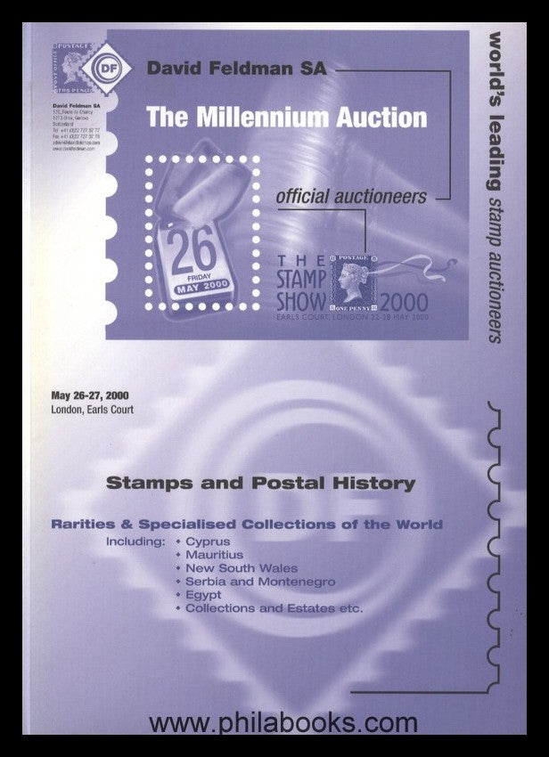 Feldman, David, Millennium Auction World Exhibition London, 26.-27.5.2000, Stamps & Postal History, Cyprus, Mauritius, New South Wales, Serbia & Montenegro, Egypt, etc., 1191 L., color, booklet, 325 S.(!), many illustrations, EL #40407