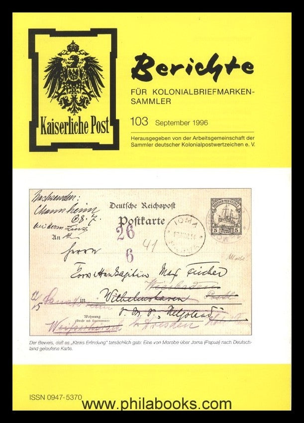 Kaiser, H., On the edition of German colonial stamps overprinted with GRI, article with illustrations and Kilian, Samoa, Small news at GRI and other articles in Reports for Colonial Stamp Collectors, 1996, Issue 103 #42048