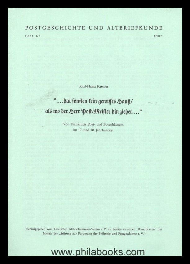 FRANKFURT AM, Kremer, '... There is no other house than where the postmaster goes...', From Frankfurt's post and messenger houses in the 17th and 18th centuries, 14 pages, illustrations, published as DASV supplement Postal History and Old Letters, Issue 67, 1982 #42795