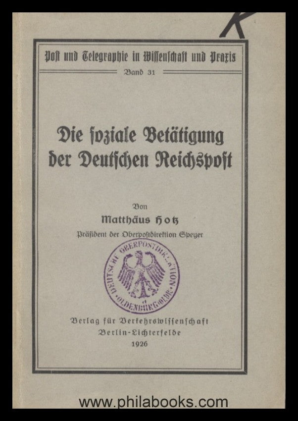 Hotz, M. (President of the Speyer Post Office), The social activities of the German Reichspost, Volume 31, Post and Telegraphy in Science and Practice, 1926, 131 pp., library stamp, well preserved #43815