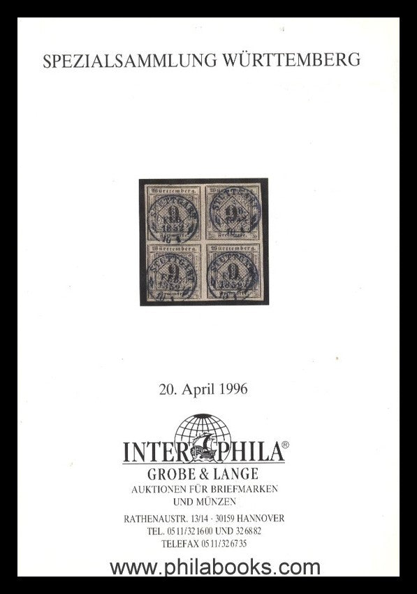 Interphila Grobe & Lange, Special Collection Württemberg, 20.4.1996, special catalogue, 1 lot, approx. 20 pages with illustrations, partly in colour, stamps and documents #44846