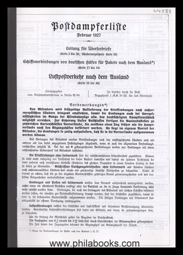 Mail steamer list February 1927, reprint of the rare original list, contains country lists with information for the transport of letters and packages abroad, including airmail, with information on airmail surcharges, 40 pp., A 4 format, paperback.[For more information, see 'Details'.] #44988