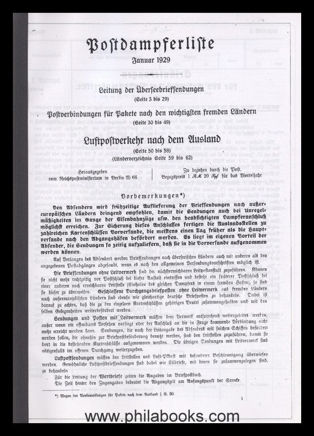 Mail steamer list January 1929, reprint of the rare original list, contains country lists with information for the transport of letters and packages abroad, including airmail, with information on airmail surcharges, 62 pages, A 4 format, paperback. [For more information, see 'Details'.] #44990