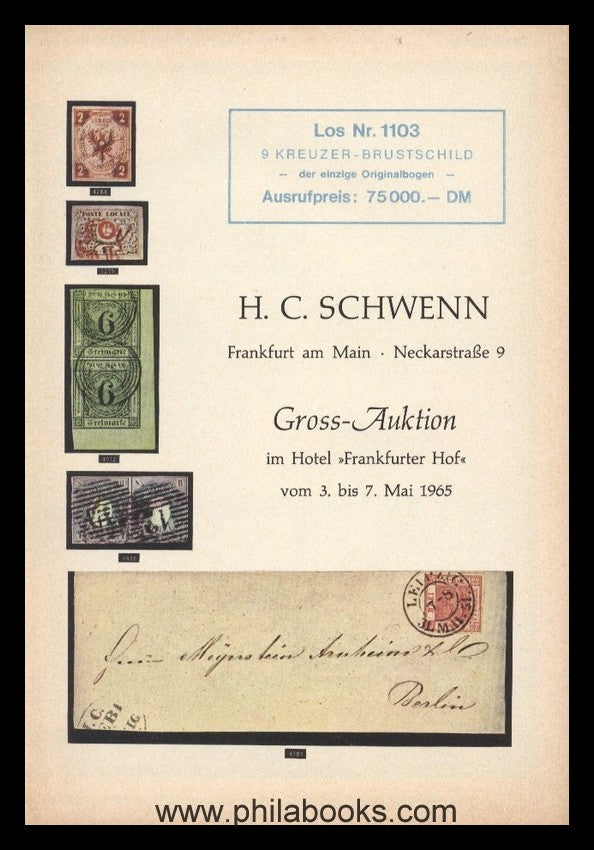 HC Schwenn, Frankfurt am Main, Neckarstraße 9, major auction in the Hotel 'Frankfurter Hof' from May 3rd to 7th, 1965, advance announcement brochure with 10 color plates for the very first Schwenn auction, rare #45414