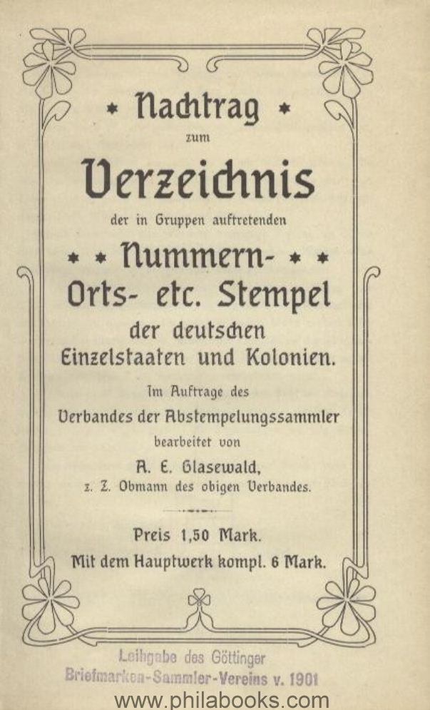 Glasewald, Supplement to the list of grouped number, location, etc. stamps of the individual German states and colonies, Gössnitz 1906, library copy, spine with signature and corresponding notes/stamps. Good binding and otherwise in good condition! In particular, the post offices of the North German postal district during the transition to the German Empire in 1871, for which the documents were still missing when the main work was published in 1905 (62 pages), as well as NDP, the relay stamps of the occupation stamps, a supplement and corrections by Mr. Wattrain from Trier, Prussia post offices without number stamps that were newly established in 1860-1867, as well as other smaller additions to numerous other areas. #48488