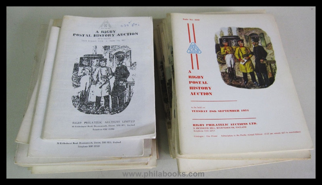 Rigby Postal History Auctions, Bournemouth, here a lot of 45 auction catalogs, possibly some photo cutouts, if Egypt was offered, found in 1 catalog, then only briefly looked through, interesting early special auction for postal history. Offered interesting international documentary material, each catalog with several illustrations, all catalogs from 1962-80, with a focus up to 1970, ex Settgast Egypt #49781
