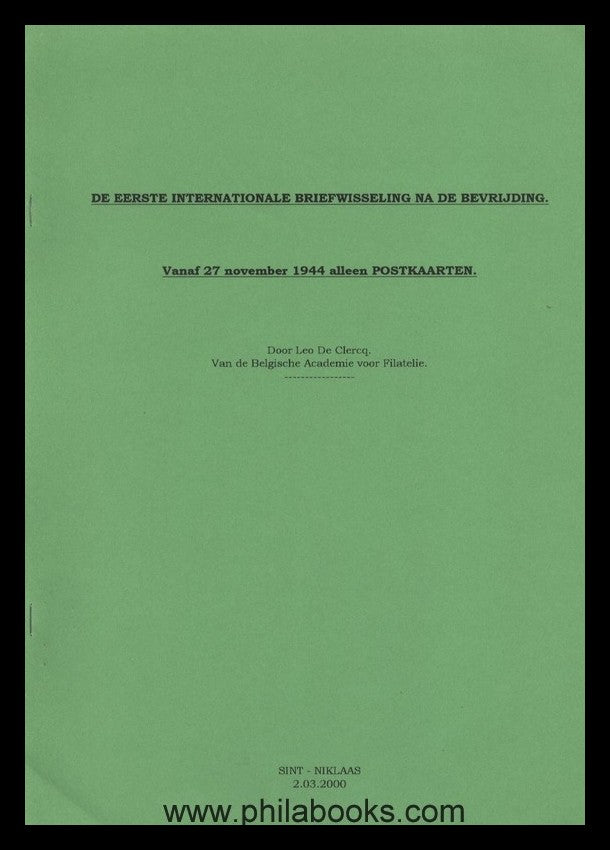 de Clercq, Leo: The First International Letter Exchange after the Liberation, From 27 November 1944 onwards, 2000, paperback copy of the exhibition collection on the first Belgian postal service after the liberation in WWII, 20 pages #50607