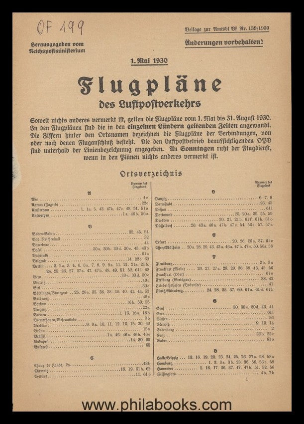 Reichspostministerium (ed.): Flight plans for airmail traffic 1 May 1930, 15 pages, rare original list, cut open, the pages individually #51856