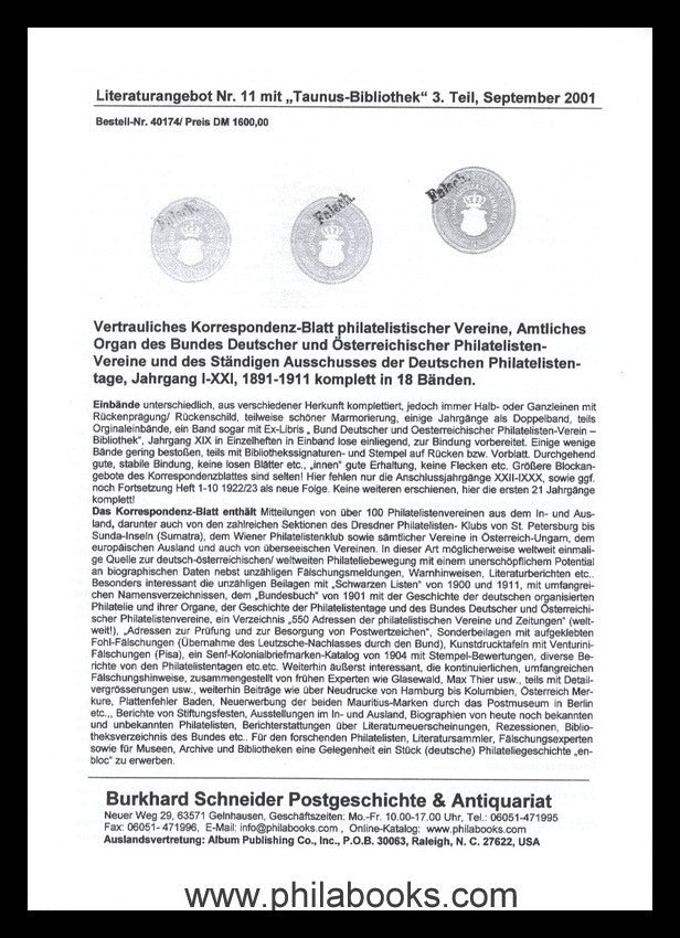 Schneider, Burkhard Literature offer No. 11 with 'Taunus Library' 3rd part, September 2001, 76 pages, dissolution of one of the best and largest German philatelic libraries at the time, out of print, here once again a copy on offer #52532