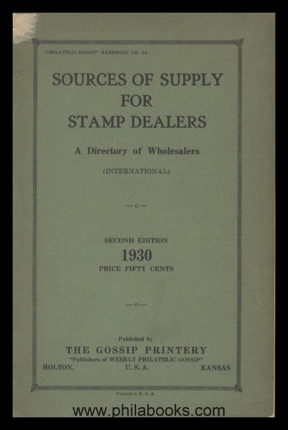 Philatelic Gossip Handbook No. 9A, Sources of Supply for Stamp Dealers, A Directory of Wholesalers, Second Edition, Holton, Kansas, USA, 1930, 58 pp. #53419