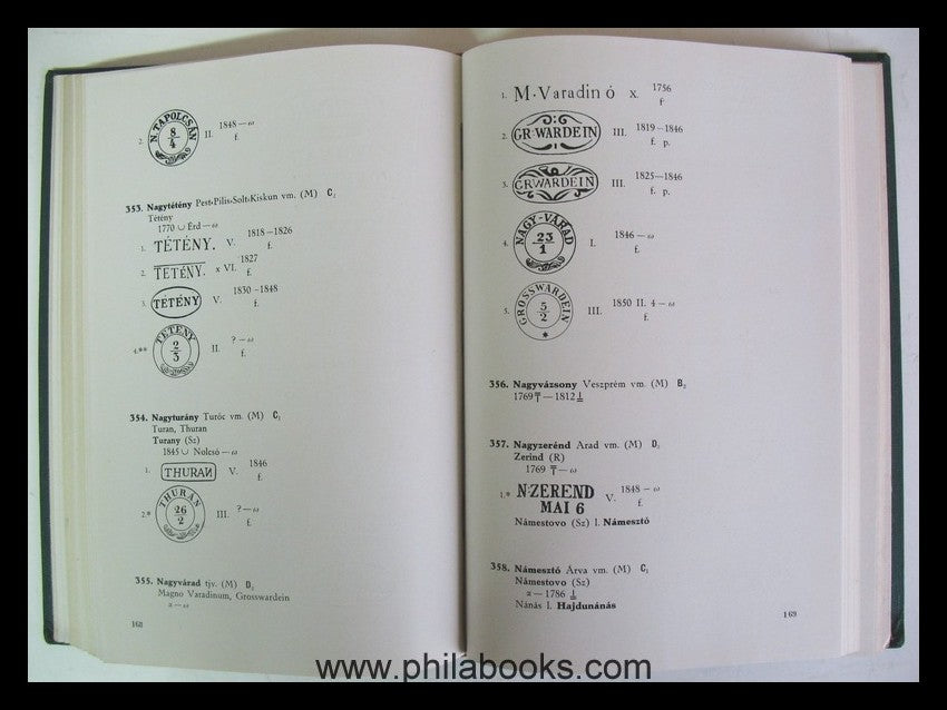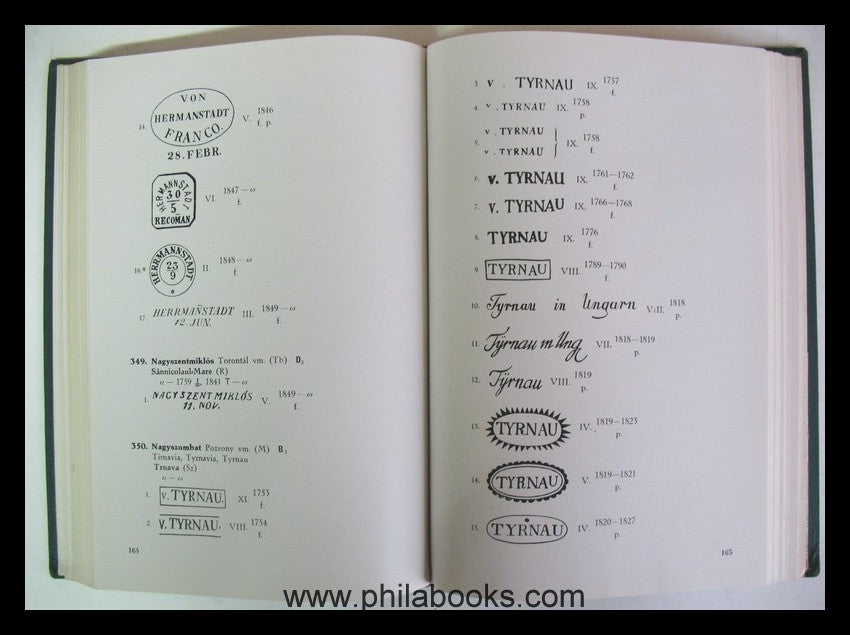 Térfi, Béla: Hungarian postal cancellations, published by the First Patriotic Association of Stamp Collectors, Budapest 1943, special edition in half-leather copy no. 46/50, 321 pages, complete with maps, spine heavily rubbed, otherwise only minor signs of age, RR! According to the foreword, cancellations from outside the actual Hungarian postal area from 1850 are also included, which are also marked accordingly in the catalogue section. These include: Transylvania, the Temes Banat, the Serbian Voivodeship, Muhr Island, most of the Romanian-Serbian border protection area and Fiume. Book is numbered but unsigned. Complete with maps in the appendix. #55346