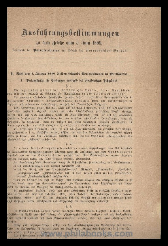 Implementation regulations for the law of June 5, 1869 concerning postage exemptions in the area of the North German Confederation, December 20, 1869, original, including postage exemptions after January 1, 1870, changes, to/from abroad, in traffic with Baden, Bavaria, Luxembourg, Austria and Württemberg, 8 pages, format A 4+, paperback, enclosed the 1st supplement for North Hesse from March 27, 1871, signs of age and use #56008