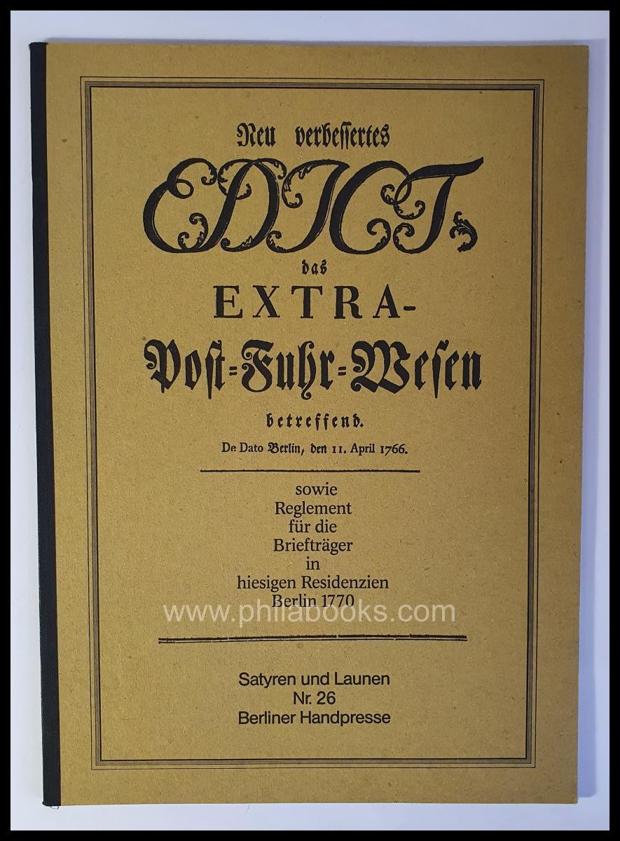 Newly improved edict concerning the extra postal transport system as well as regulations for the postmen in local residences, Berlin 1770, Berliner Handpresse, Satyren und Launen No. 26, bibliophile REPRINT, large format, cardboard cover, Ex. 122/1000, signed #57604