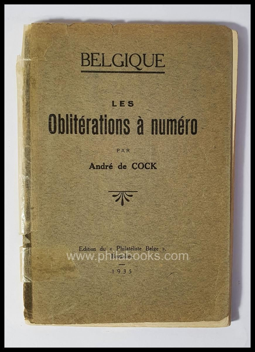 Cock, A., Belgique les Oblitérations à numéro, 1935, small format, paperback, 110 pages, here a 'shot through' copy with inserted blank pages for contributors, cover and some pages loose, defective copy #57723