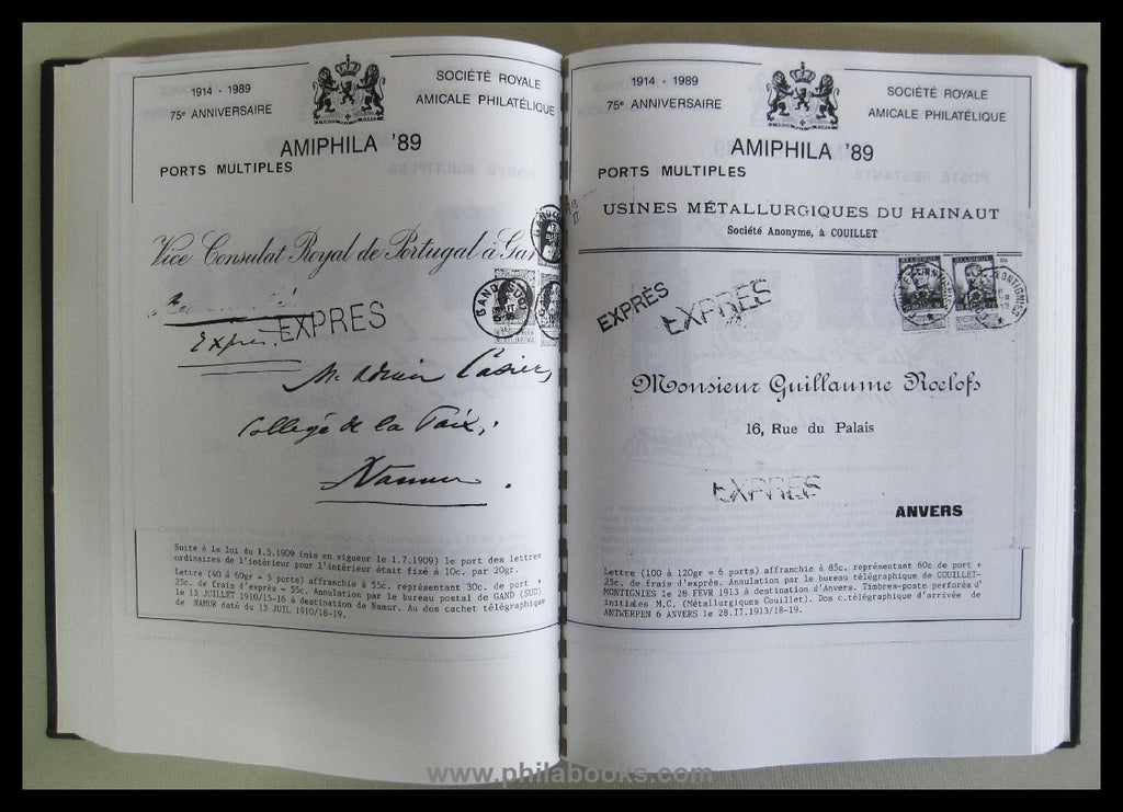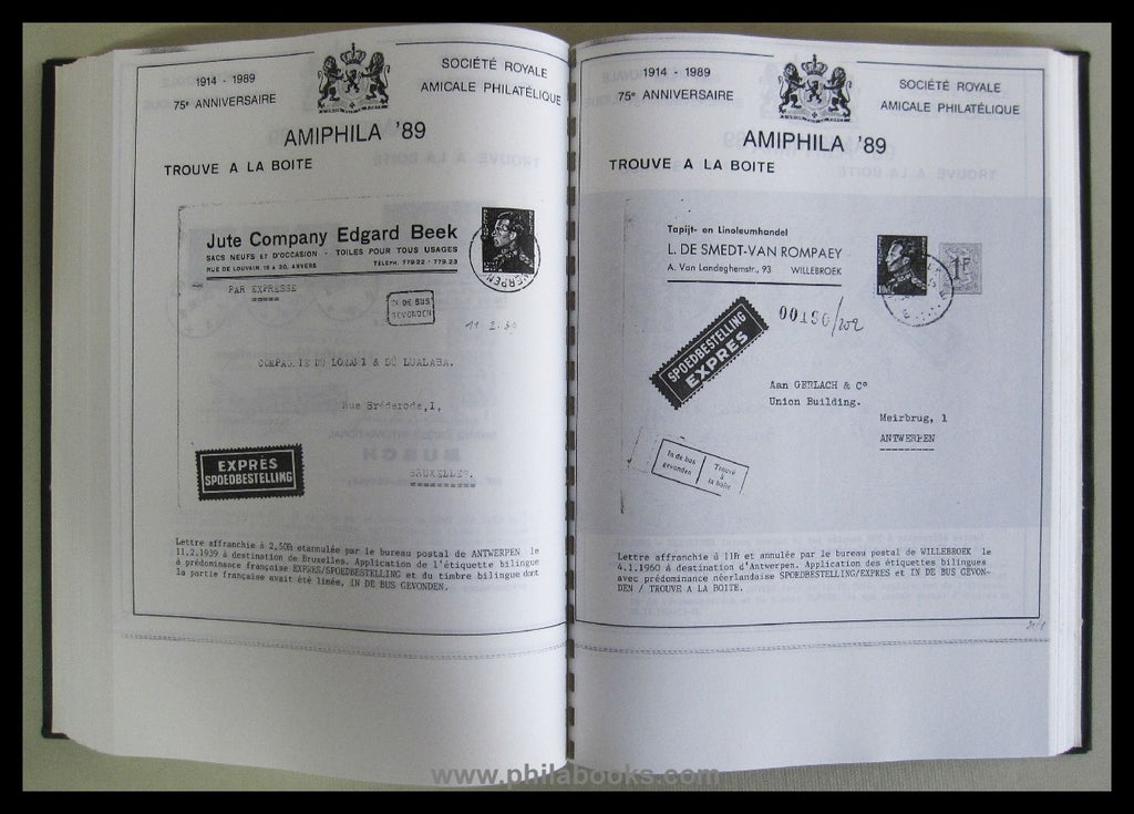 Expres Amphila '89, Society Royale Amicale Philatelique 1914-1989, 75e anniversaire, bound in cloth copy of an exhibition collection of Belgian Express letters, French descriptions, approx. 250 pages, good copy #58096