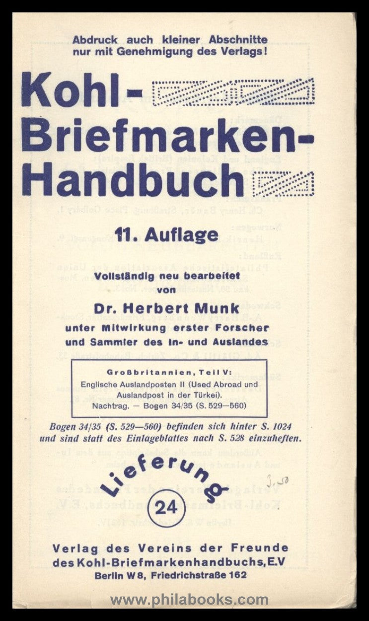 Kohl Stamp Handbook, 11th Edition, Issue 24, 1931, Great Britain, Part V: English Post Offices II (Used Abroad and Foreign Mail in Turkey, Supplement - Sheet 34/35 (pp. 529-560), paper browned, edge defects #58775