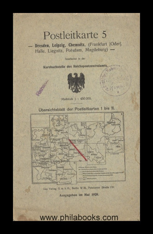 Postal code map 5, Dresden, Leipzig, Chemnitz, (Frankfurt /Oder), Halle, Liegnitz, Potsdam, Magdeburg, 1929, edited in the timetable office of the Reichspostzentralamt, Gea-Verlag, Berlin, format 57 x 70 cm, multi-coloured, folded, cover and back of the map spotty and small edge defects, the map itself good #59430