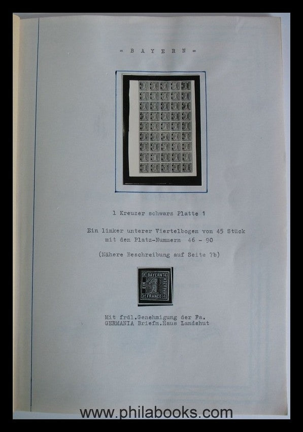 Gundel, H., Bavaria 1 Kreuzer black - 1 November 1849, plate errors and printing coincidences and their order in the large sheet along with other interesting connections to this stamp, handbook produced by the author himself in a small edition with 4 glued-in original photos, including from the lower quarter sheet of plate 1. #60104