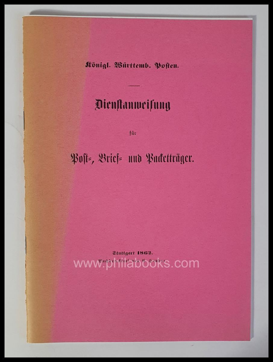 Royal Württemberg Post Office, Service instructions for postmen, letter carriers and parcel carriers, Stuttgart, 1862, 32 pages, paperback REPRINT (1995), on part of the front and back side stripes bleached by the sun (see scans) #60596