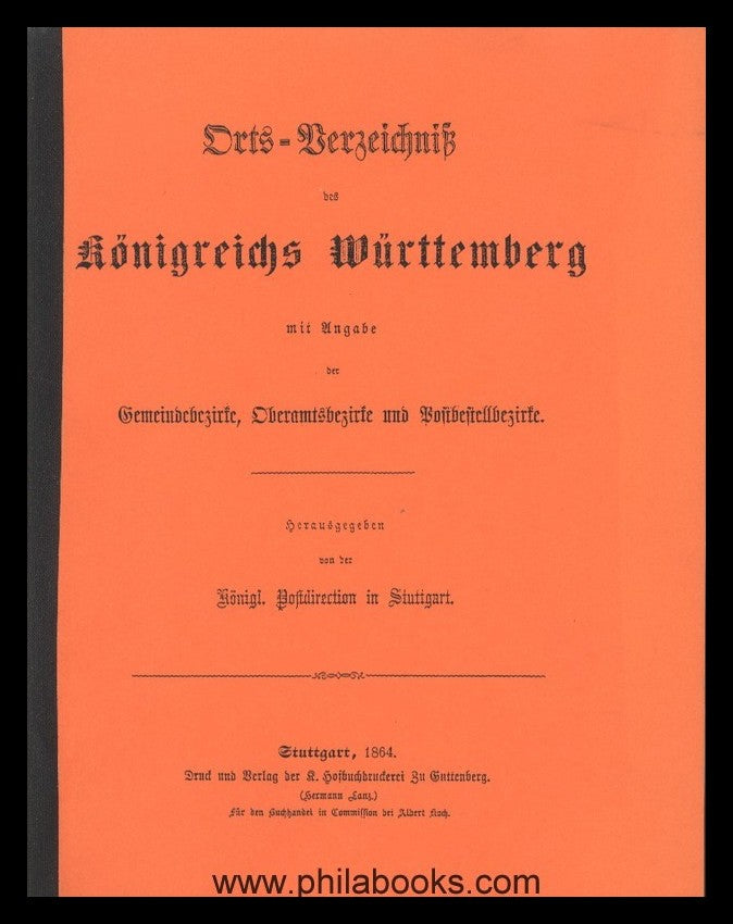 Local directory of the Kingdom of Württemberg with details of the municipal districts, administrative districts and postal order districts, Stuttgart, 1864, 256 pp., paperback REPRINT #60598
