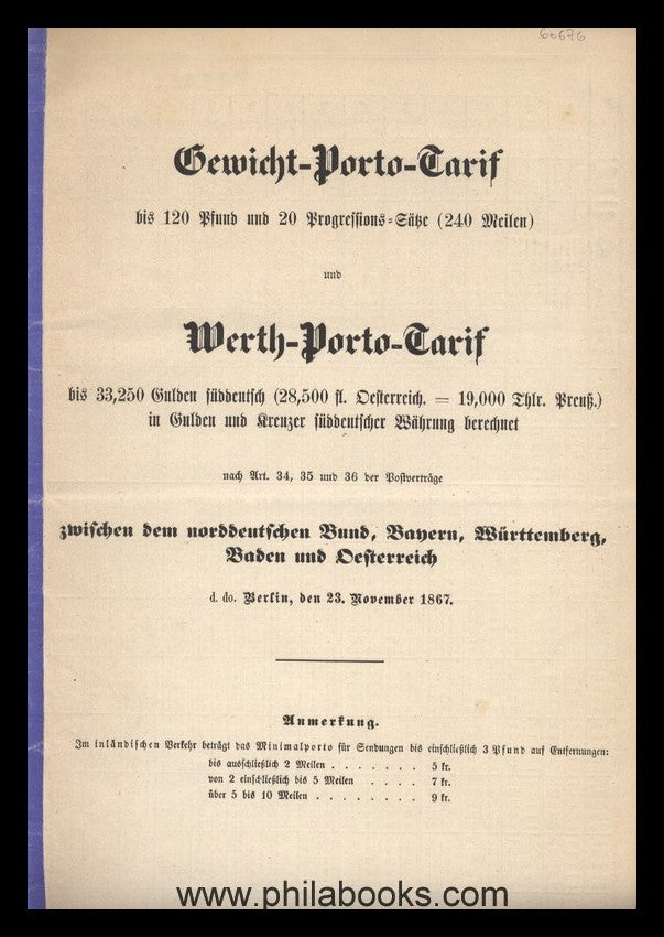 Weight-postage tariff and value-postage tariff between the North German Confederation, Bavaria, Württemberg, Baden and Austria (1867), 6 pp., original, #60676