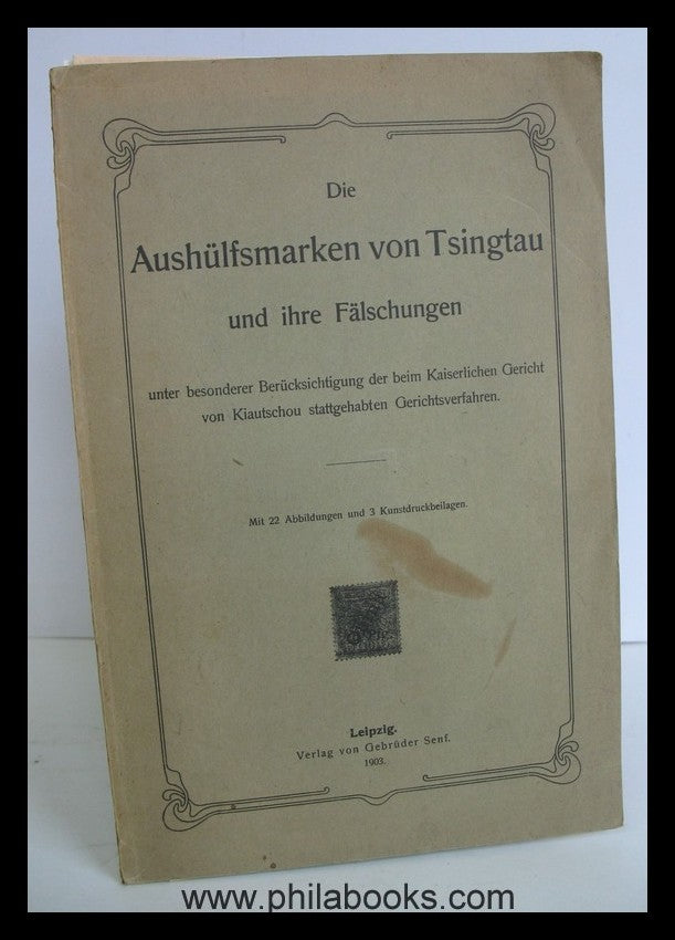 Friedemann, A., The auxiliary stamps of Tsingtau and their forgeries with special reference to the legal proceedings that took place at the Imperial Court of Kiautschau, Verlag Gebrüder Senf, 1903, 55 pages, 22 illustrations, 3 art print supplements, paperback, on the art print supplements illustrations of the forgeries in the whole sheet, with some research supplements from the Röhm library, slightly stained, otherwise in good condition, very rare, first copy offered by us! #63296