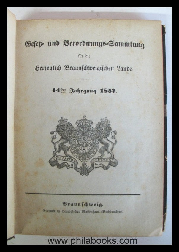 Collection of laws and regulations for the Ducal Brunswick lands, 44th year 1857, 238 pages, contemporary cardboard cover with leather spine label, signs of wear, hardback #63842