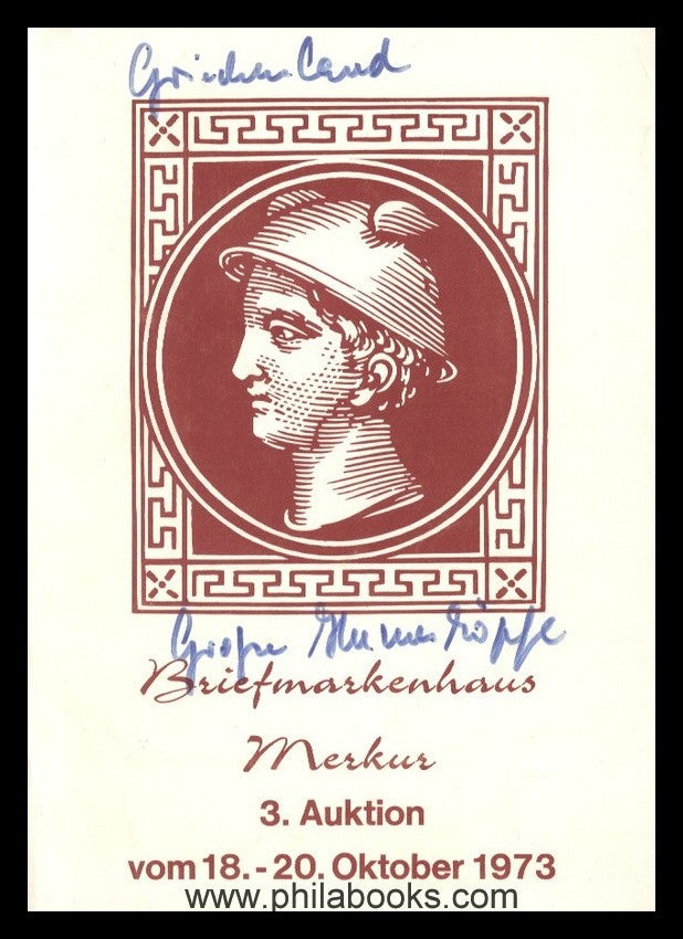 Briefmarkenhaus Merkur, 3rd auction 18.10.-20.10.1973, Old Germany, German Empire, Europe, Overseas, 4282 lots, 244 pages, 120 plates, 6 of which with color illustrations, including interesting offers Bavaria test stamps and especially Greece large Hermes heads with a multi-page special catalog. #63933