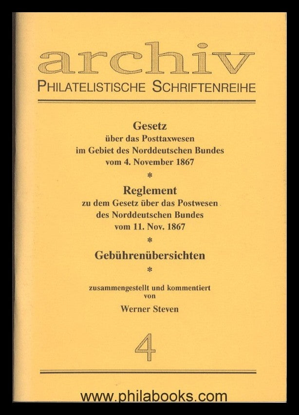 Steven, W., Law on the postal tax system in the area of the North German Confederation of November 4, 1867, Regulations on the Law on the Postal System of the North German Confederation of November 11, 1867, Fee Overviews, in: archiv Philatelic Series No. 4/1993, 122 p. #64139