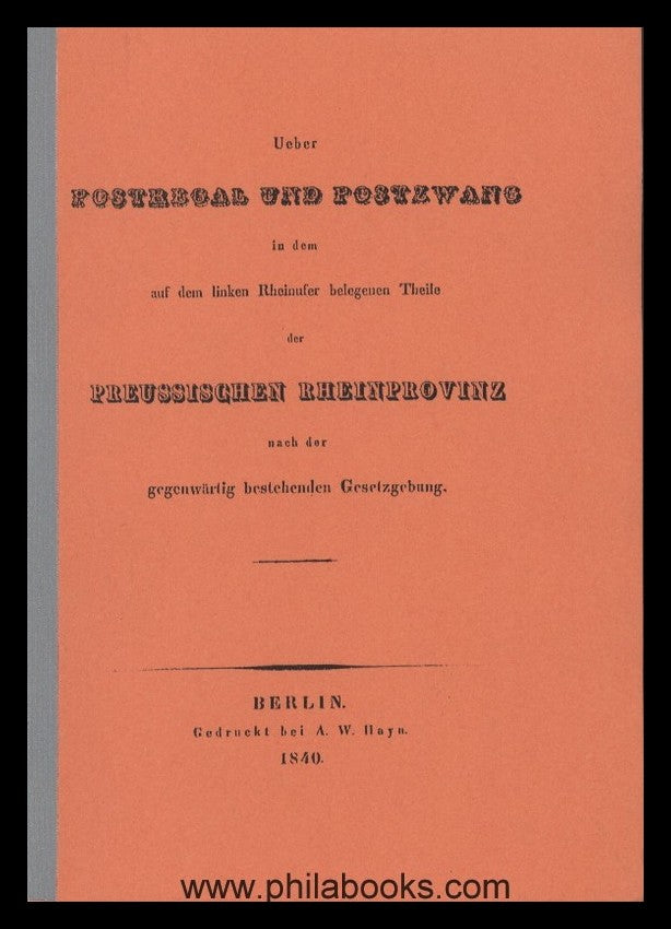 On postal royalty and compulsory postal service in the part of the Prussian Rhine Province located on the left bank of the Rhine according to the current legislation, Berlin 1840, REPRINT, 128 pp., very good copy, even the reprint is not common #65267
