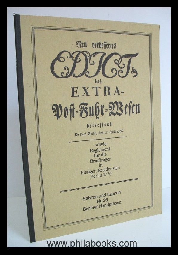 Otto, U. (ed.), Newly improved edict concerning the extra postal transport system, dated Berlin, 11 April 1766 and regulations for postmen in local residences Berlin 1770, series Satyrs and Whims No. 26, Berliner Handpresse, signed and numbered copy 159/1000, REPRINT #65510