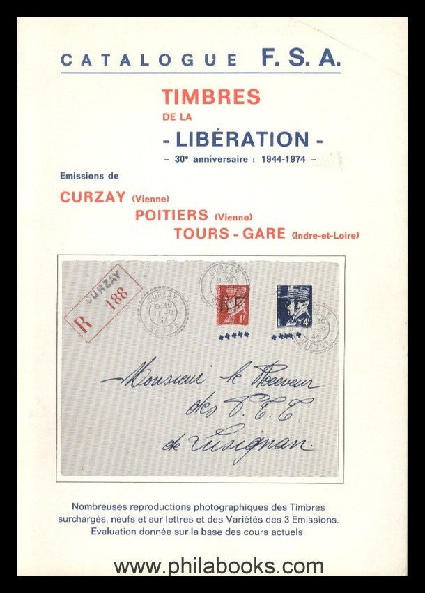 FSA Catalogue, Timbres de la Liberation, 30th anniversaire 1944-1974, Emissions de Curzay (Vienne), Poitiers (Vienne) Tours-Gare (Indre-et-Loire), special catalog of the French liberation editions from 1944, 48 pages, with many b&w illustrations #65787