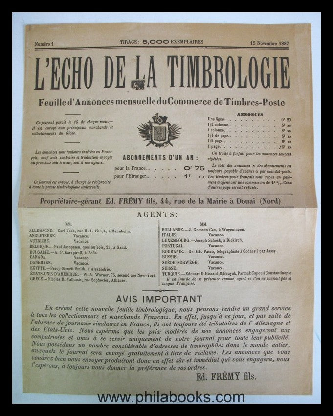 L'Echo de la Timbrologie, Feuille d'Annonces mensuelle du Commerce de Timbre-Poste, Numéro 1, 15 November 1887, Ed. Frémy fils, Douai, French advertising paper for the stamp trade, double page, Crawford 537/2067 #66052