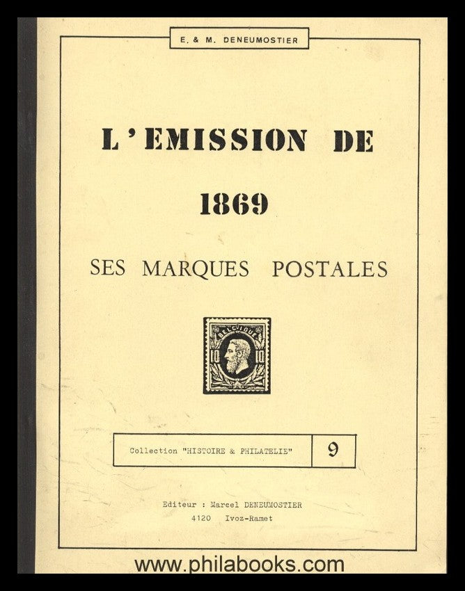 Deneumostier, E. & M., L'Emission de 1869 Ses Marques Postales, 1980, 209 pp., with illustrations, special handbook Belgium edition 1869, stamps, units, plate errors, cancellations with rarity information, documents, some pages stained, otherwise in good condition #66057