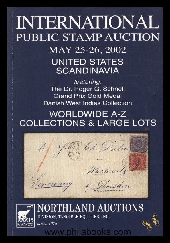 Northland Auctions, Public Stamp Auction, 25.-26.05.2002, United States, Scandinavia, feat. The Dr. Roger G. Schnell Grand Prix Gold Medal Collection Danish West Indies, 1281 lots, 117 pages, numerous partially colored illustrations, important reference catalog of the prominent US collector #66108