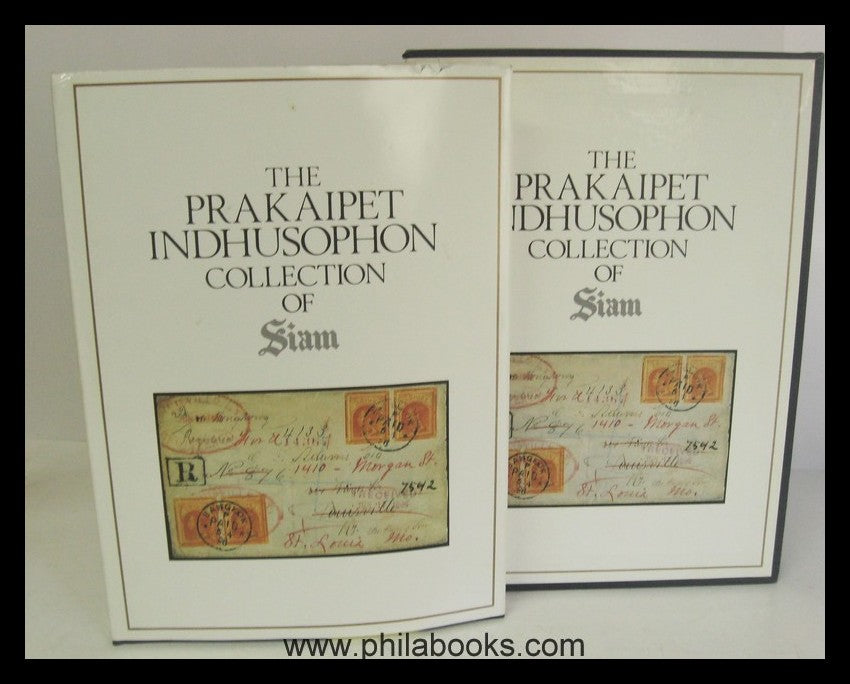 The Prakaipet Indhusophon Collection of Siam, A selection of Thai Stamps and related materials from Pre-stamp period (ca 1835) to 1910, 1989, 240 pp. Color catalog of the fantastic collection, now out of print! Freshly printed copy, dust jacket with slight edge defects on the top edges, the slipcase in very good condition and not heavily dented as is usually the case! #66304