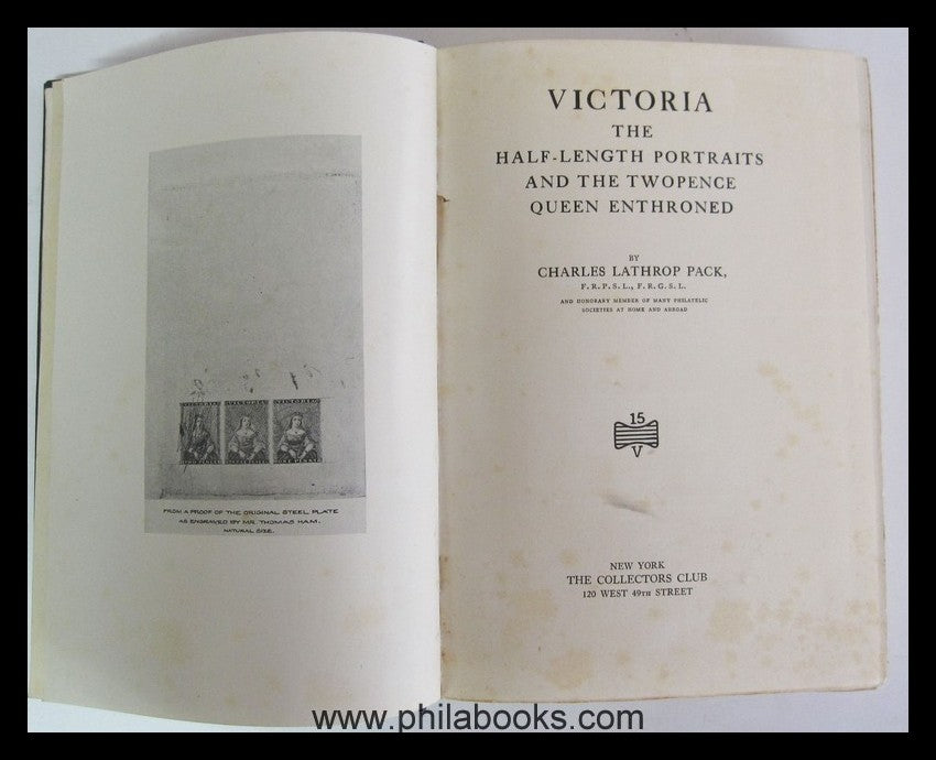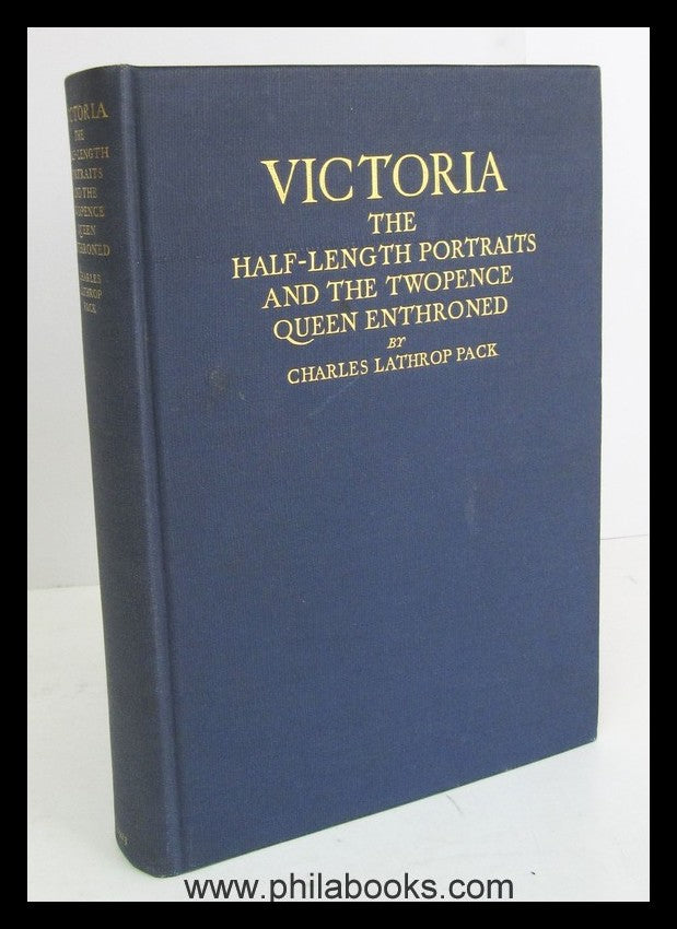 Pack, CL, Victoria The Half-Length Portraits and the Twopence Queen Enthroned, Collectors Club, New York, 1923, blue linen with embossing, gold-edged head, 273 pages, with 81 illustrations in the text and on 30 plates (art paper), awarded the Crawford Medal in 1923, inside partly slightly disturbing light paper stains, 2 pages slightly torn in the fold, the pages as often somewhat unevenly hand-cut, externally well preserved and firm binding. #66384