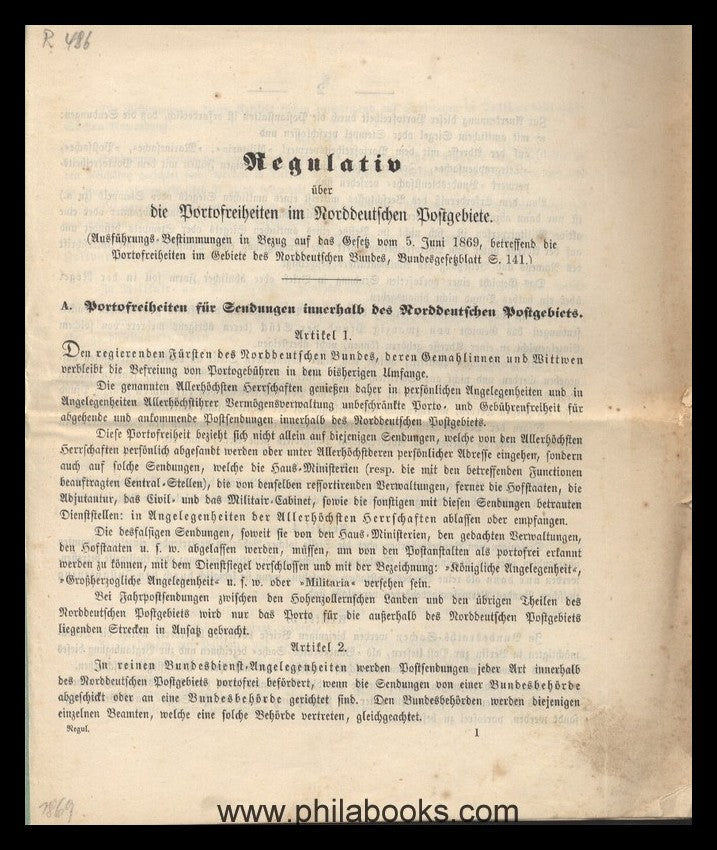 Regulation on postage exemptions in the North German postal area, 1869, 14 pages, original, also contains postage exemptions in postal traffic with Baden, Bavaria, Luxembourg, Austria and Württemberg. Marginal defects outside the text, fold marks #67063