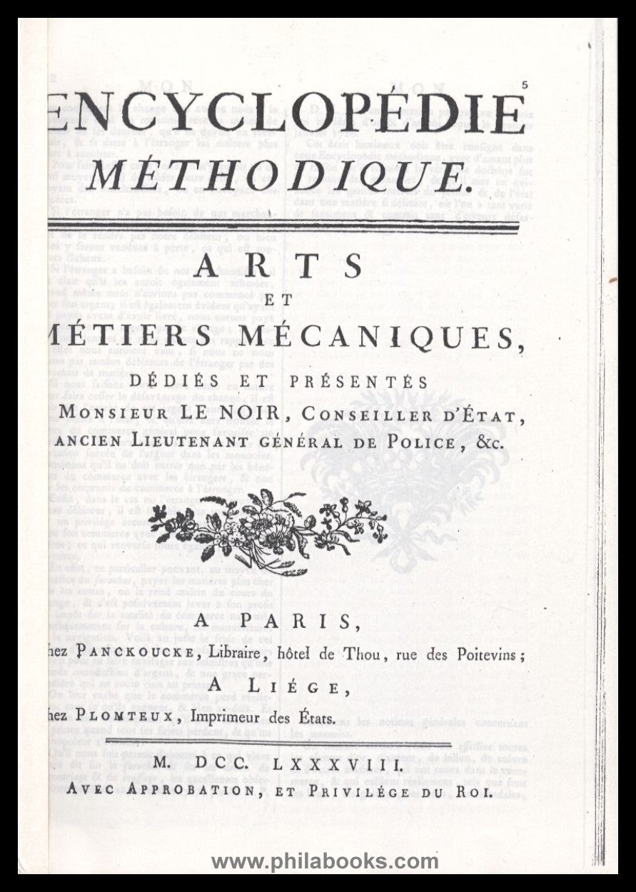 Encyclopédie Méthodique, Arts et Métiers Mécaniques, dédiés et présentés Monsieur Le Noir, Conseiller d'État, ancien Lieutenant Général de Police, &c., 1788, paperback COPY of the rare publication on the currencies of the world ca. 88 pp. #68279