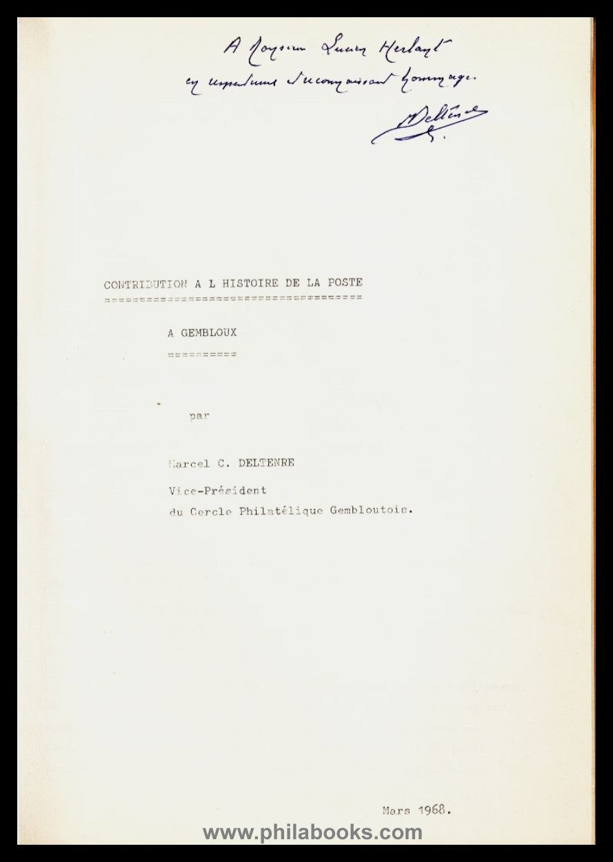 Deltenre, M., Contribution a l'Histoire de la Poste à Gembloux, 1968, 7 pp. with illustrations, with dedication to Lucien Herlant #68428