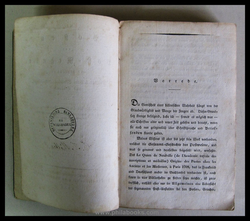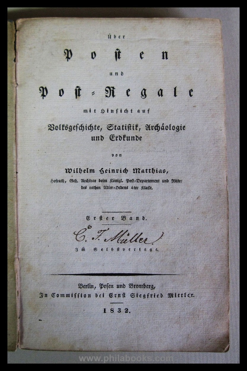 Matthias, Wilhelm Heinrich: About posts and postal services, with regard to folk history, statistics, archaeology and exploration, first volume (of 2), 1832, 368 pages, contemporary hardback, the cover has slight defects, binding is firm, minor signs of age and wear, very rare, ex Pietz. Contains detailed chapters on postal transport/postal services in ancient times, the history of the 'post', the development of postal roads, posts, messenger services, Thurn and Taxis post, fiefdoms, imperial post, history of the Prussian post/services/tariffs/postal services, postal services in Bavaria, Hanover/in the German states. #69279