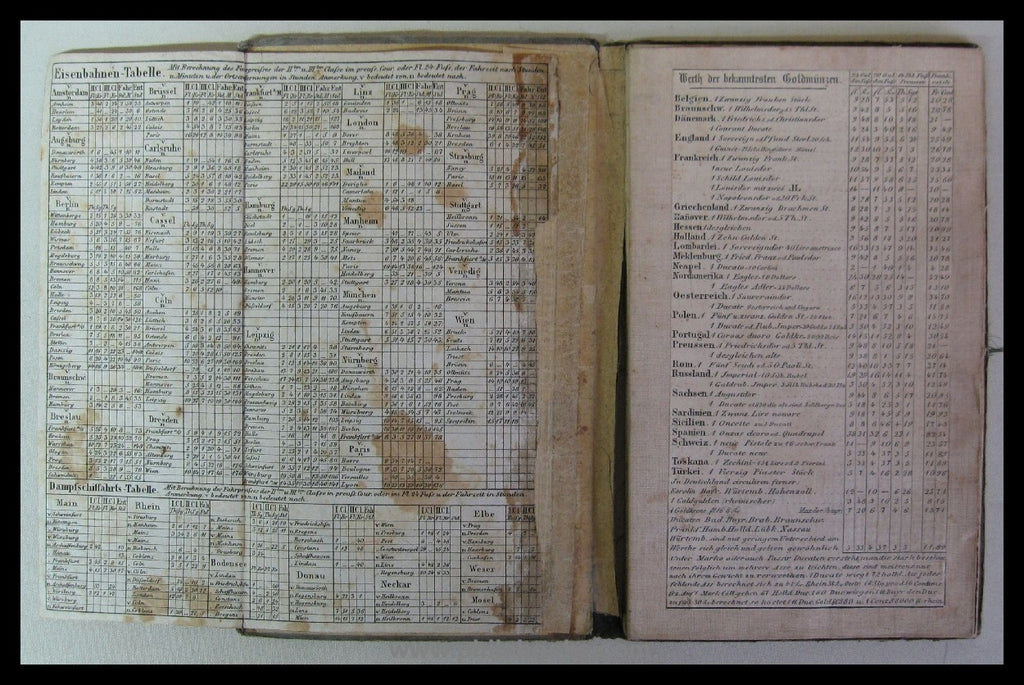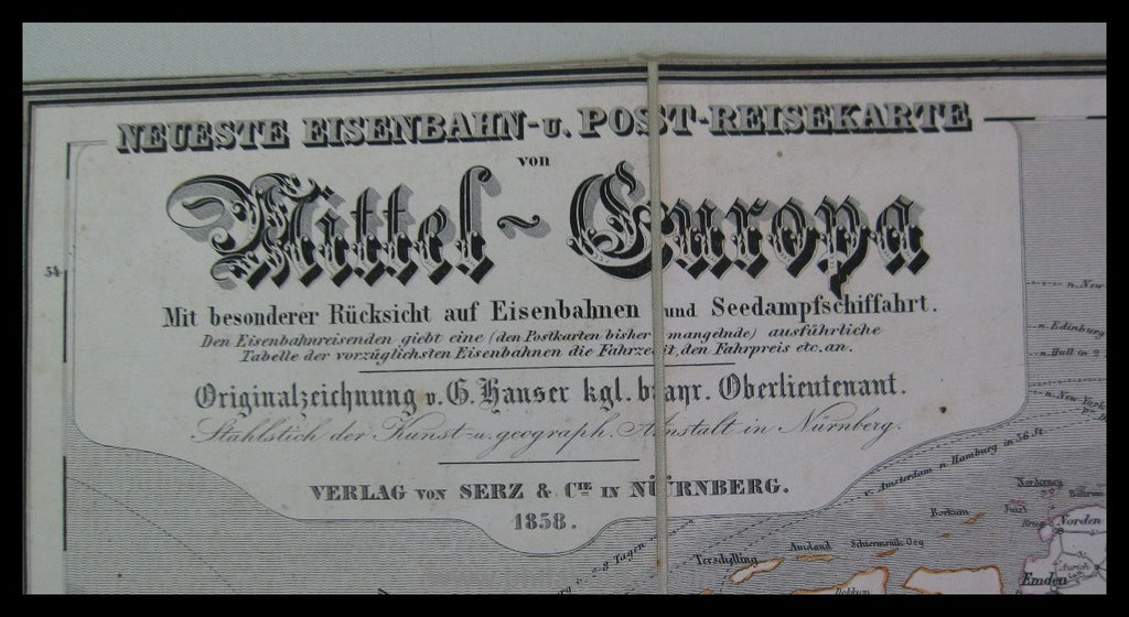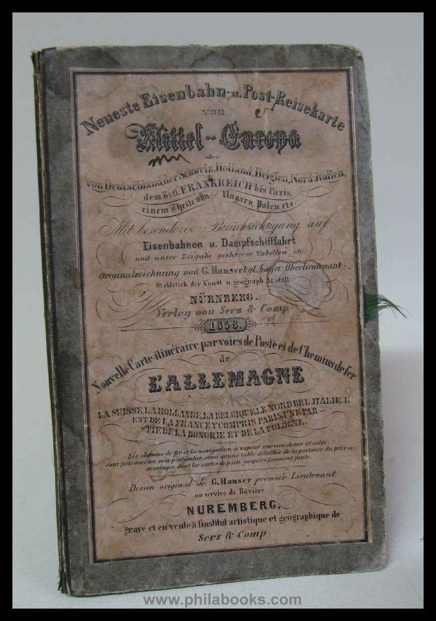 Latest railway and postcard from Central Europe, Nuremberg, original drawing by G. Hanser, Royal Bavarian First Lieutenant, published by Serz & Co., Nuremberg, 1858, the multi-coloured folding map in good condition, the cover has defects #69321