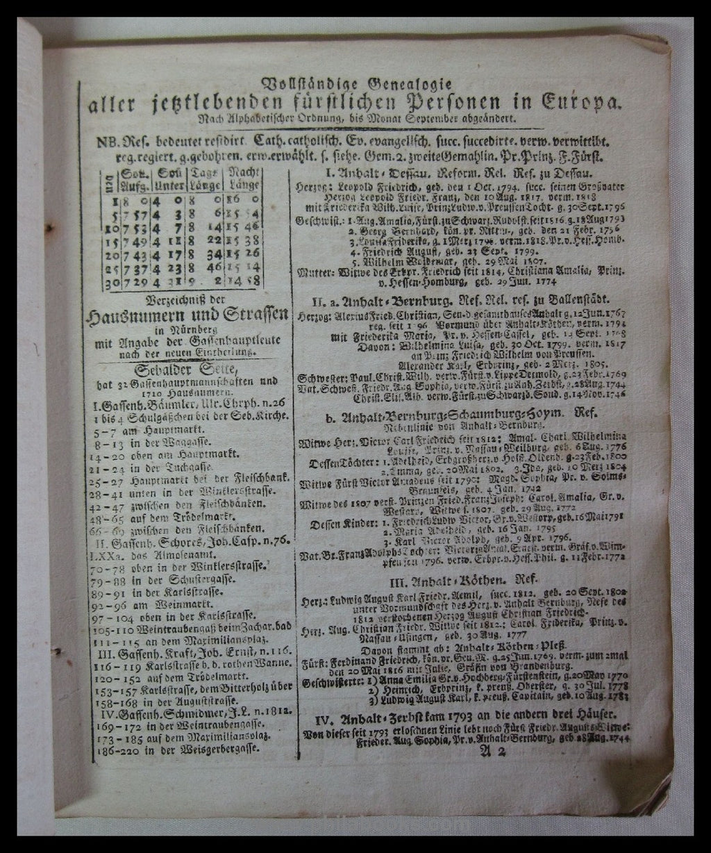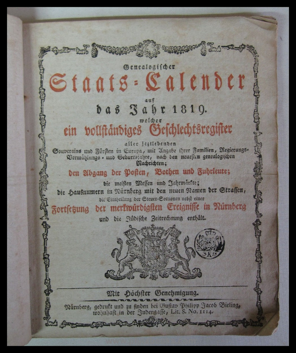 NUREMBERG: Genealogical State Calendar for the year 1819 (….), 'Agnag der Posten, Bothen und Fuhrleute', the house numbers in Nuremberg with the new names of the streets, 1819, cardboard cover of the time #69331