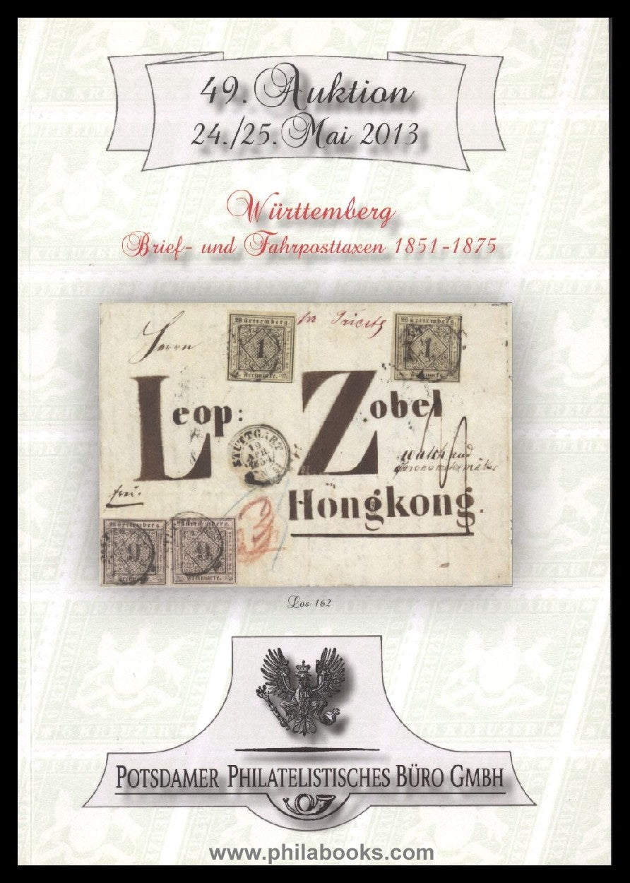Potsdam Philatelic Office, 49th Auction, 24/25 May 2013, Württemberg Letter and Travel Post Rates 1851-1875, Hans-Wolfgang Reiner Collection, 2013, color catalogue, 72 pages #69491