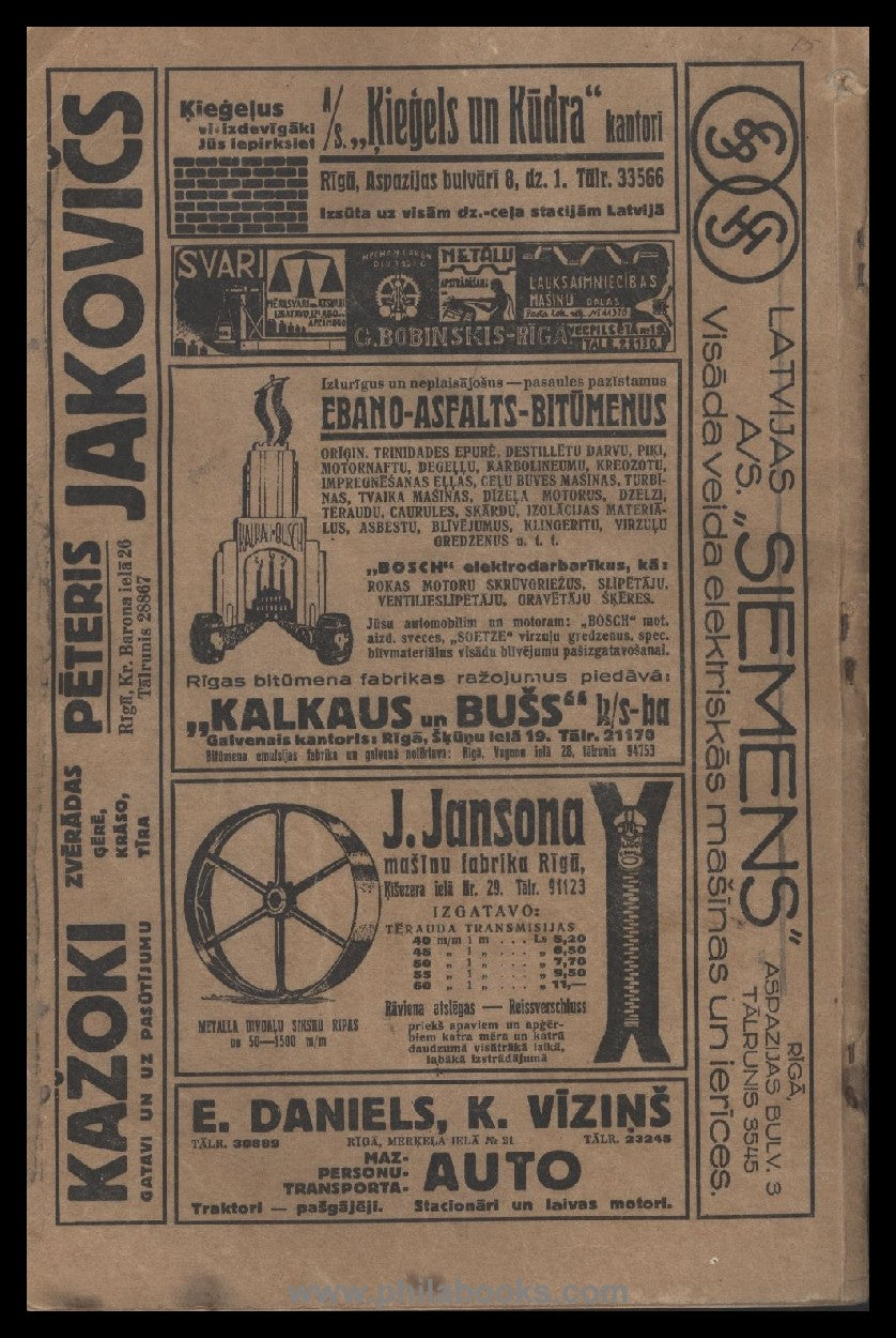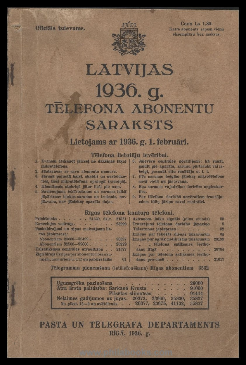 Pasta un Telegrafa Departaments, Latvijas 1936. g. Telefona Abonentu Saraksts, Telephone book Latvia 1936, with street and house number information, cover with slight signs of wear, otherwise in good condition, hard binding, #70751