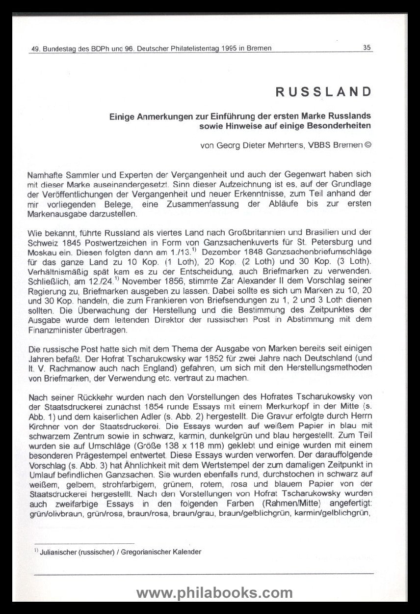 Mehrtens, GD, Russia, Some notes on the introduction of the first stamp of Russia as well as information on some special features, published in the commemorative publication of the Association of Bremen Stamp Collectors, 12-15 October 1995, with coloured illustrations #70785
