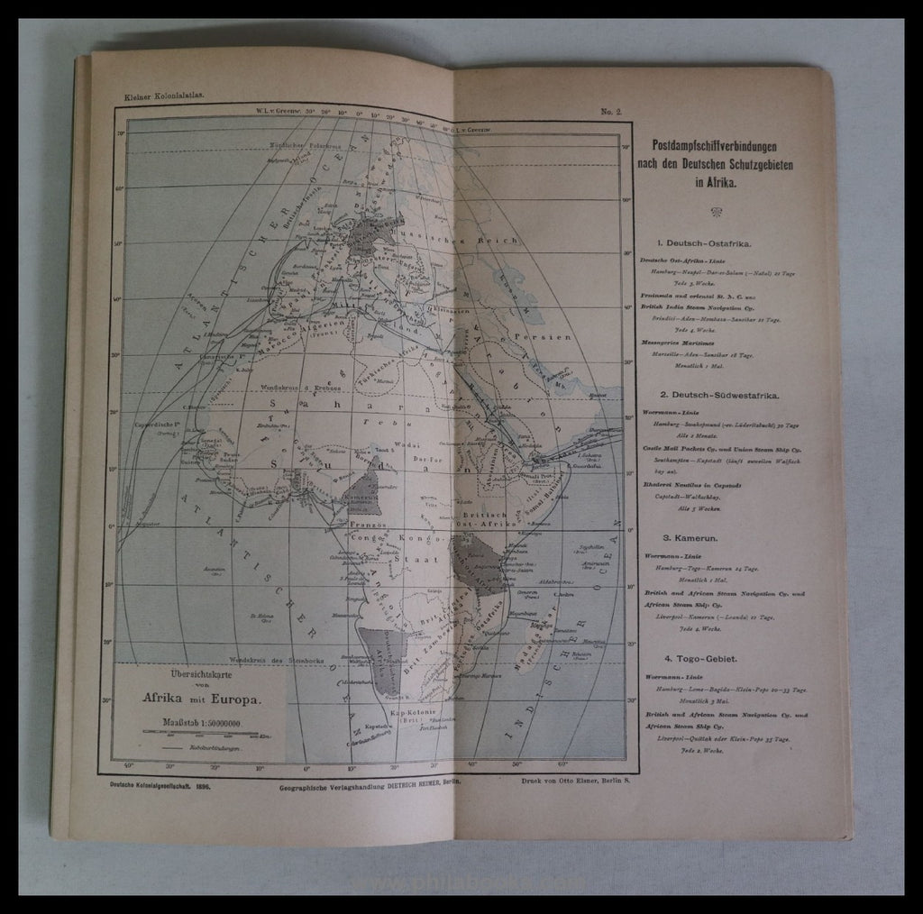 Small German Colonial Atlas, published by the German Colonial Society, 1896, original edition, 2 sheets with a small tear on the side, otherwise an above-average well-preserved copy without binding defects, #71525