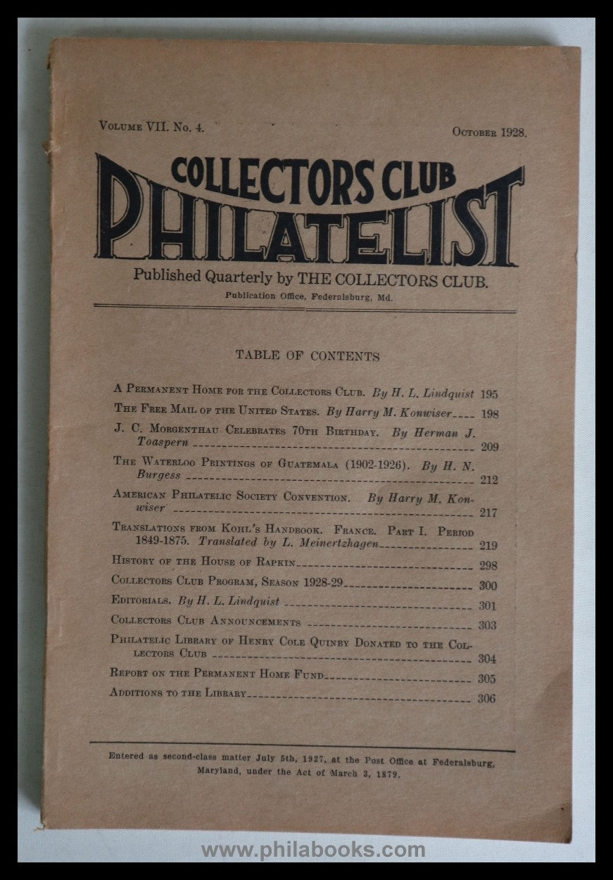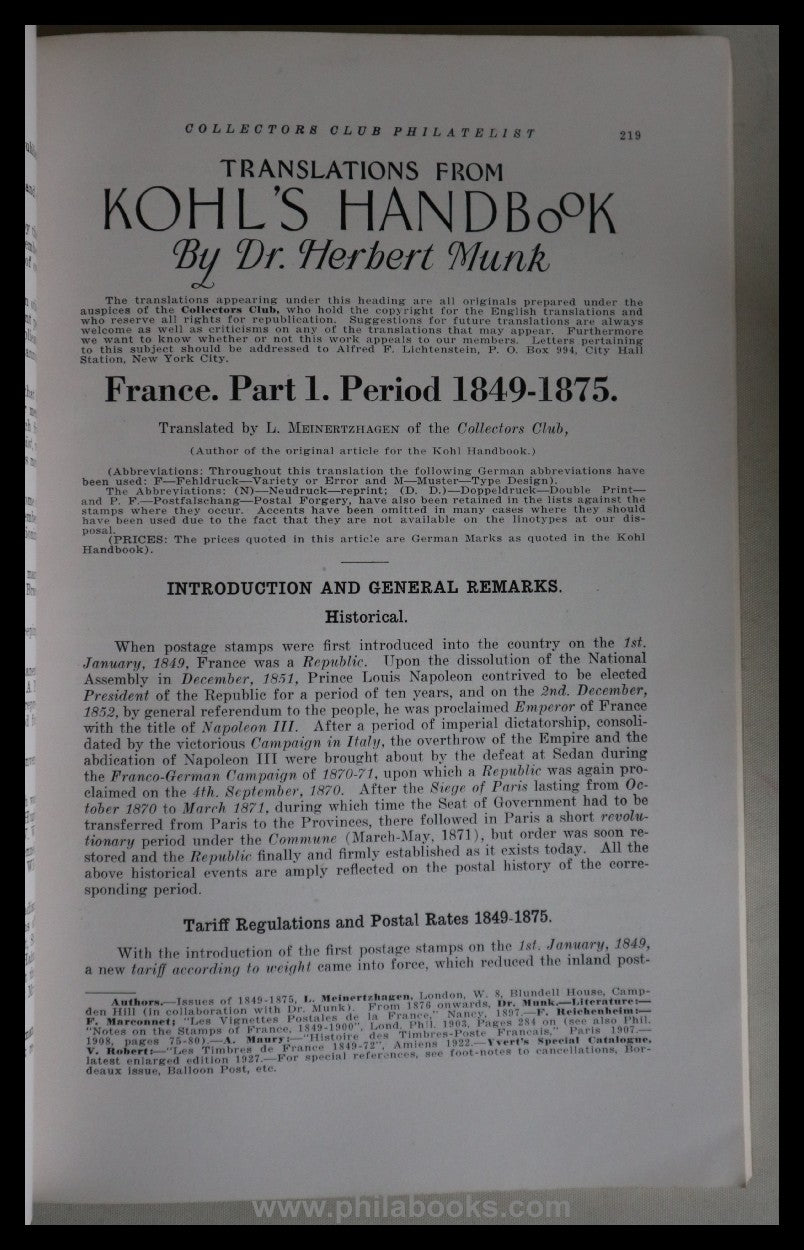 Meinertzhagen, L., Translations from the Kohl's Handbook. France, Part I. Period 1849-1875, Collectors Club Philatelist Volume VII No. 4, October 1928, 78 pp., with illustrations, above-average condition, Meinertzhagen had also written this part for the original German edition, Alfred Lichtenstein acquired the translation rights for the Collectors Club #71558